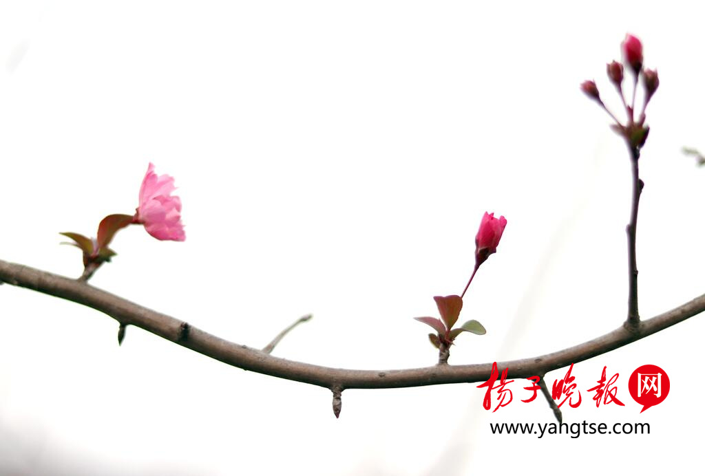 21日,虽然天气寒冷,但在句容城区的贾纪山公园里,一株海棠树上光光的枝干上,点点粉红却点缀其间。记者看到,有的海棠花瓣完全盛开,有的则含苞待放。小巧的花骨朵,甚是惹人怜爱。