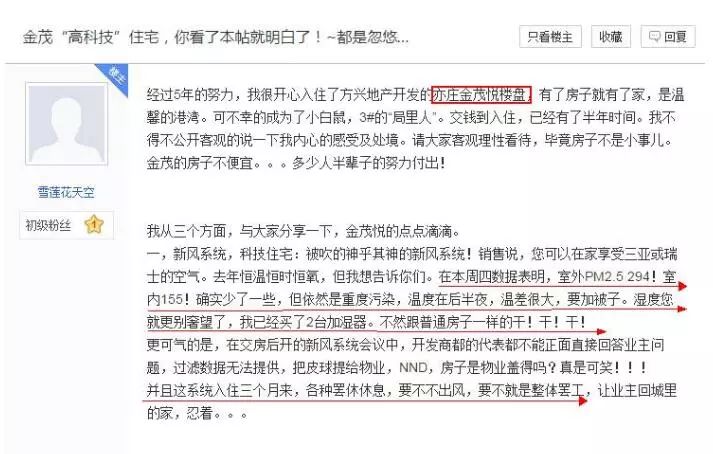 此外,也有业主爆料,金茂吹嘘的新风系统、科技住宅,入住后没有达到开发商前期宣传的效果。