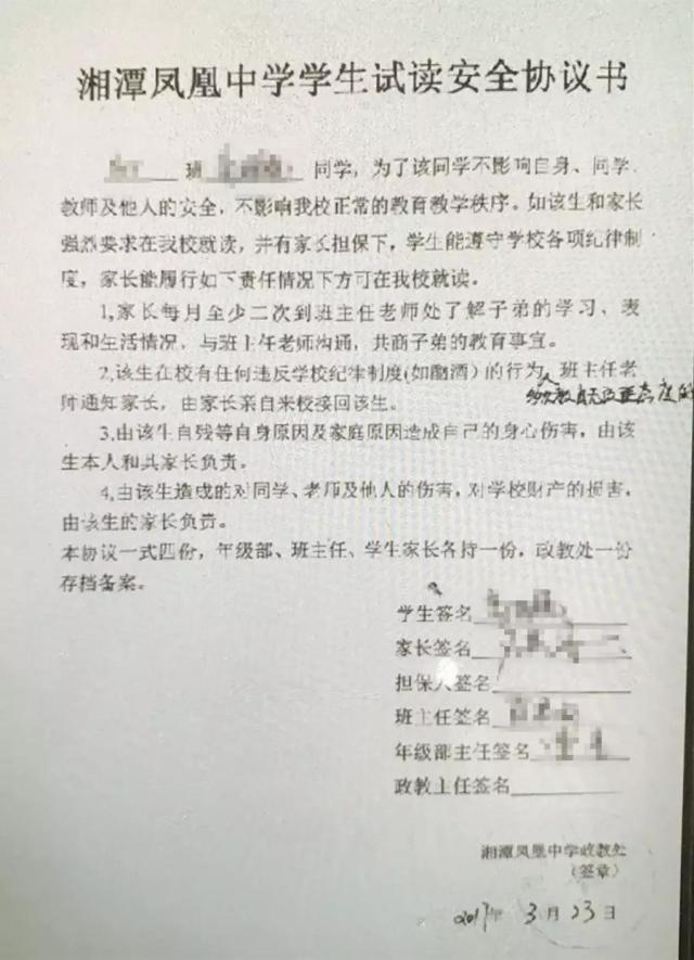 凤凰中学提供的一份《学生试读安全协议书》显示,3月23日,双方签订了协议,写明“该生在校有任何违反学校纪律制度的行为,多次教育无改正态度的,班主任老师通知家长,由家长亲自来校接回该生”“由该生自残等自身原因及家庭原因造成自己的身心伤害,由该生本人和其家长负责”。